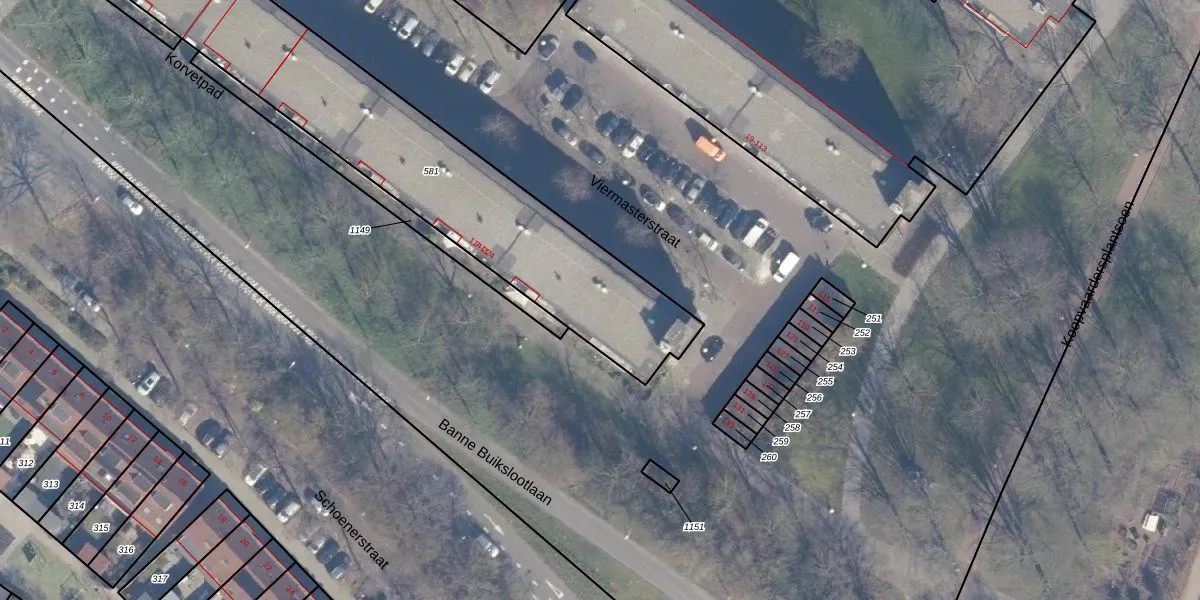 Het perceel waarop Viermasterstraat 162 staat heeft een oppervlakte van 2280 m². Dit is een zeer groot perceel. De perceeloppervlakte wordt geregistreerd door het Kadaster. Gedetailleerde informatie over de maten van dit perceel kunt u vinden in het rapport Kadastrale kaart met maatvoering van Viermasterstraat 162.