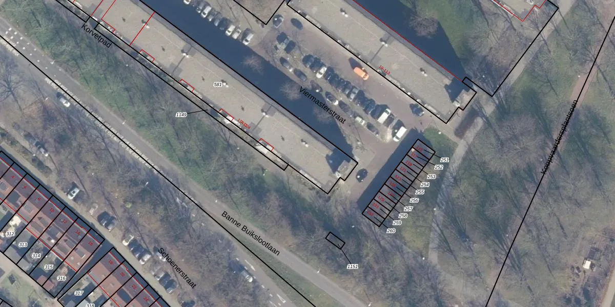 Het perceel waarop Viermasterstraat 172 staat heeft een oppervlakte van 2280 m². Dit is een zeer groot perceel. De perceeloppervlakte wordt geregistreerd door het Kadaster. Gedetailleerde informatie over de maten van dit perceel kunt u vinden in het rapport Kadastrale kaart met maatvoering van Viermasterstraat 172.