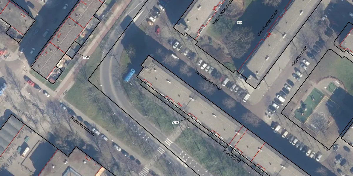 Het perceel waarop Viermasterstraat 82 staat heeft een oppervlakte van 2280 m². Dit is een zeer groot perceel. De perceeloppervlakte wordt geregistreerd door het Kadaster. Gedetailleerde informatie over de maten van dit perceel kunt u vinden in het rapport Kadastrale kaart met maatvoering van Viermasterstraat 82.