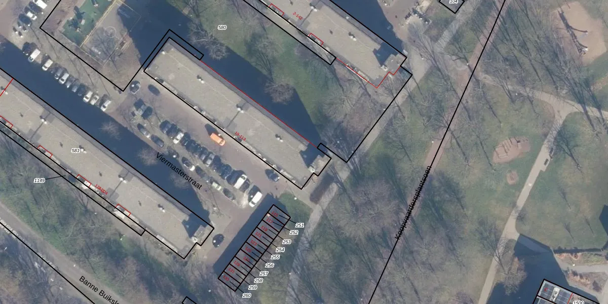 Het perceel waarop Viermasterstraat 99 staat heeft een oppervlakte van 5843 m². Dit is een zeer groot perceel. De perceeloppervlakte wordt geregistreerd door het Kadaster. Gedetailleerde informatie over de maten van dit perceel kunt u vinden in het rapport Kadastrale kaart met maatvoering van Viermasterstraat 99.