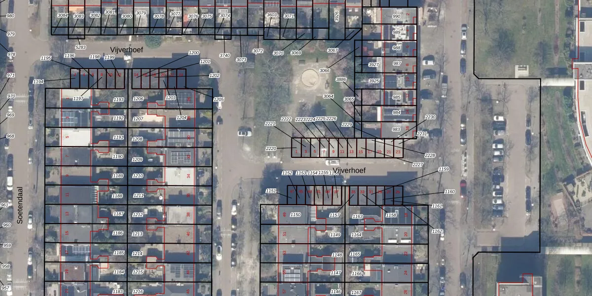 Het perceel waarop Vijverhoef 1 staat heeft een oppervlakte van 21 m². Dit is een klein perceel. De perceeloppervlakte wordt geregistreerd door het Kadaster. Gedetailleerde informatie over de maten van dit perceel kunt u vinden in het rapport Kadastrale kaart met maatvoering van Vijverhoef 1.