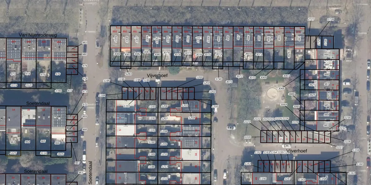 Het perceel waarop Vijverhoef 22 staat heeft een oppervlakte van 20 m². Dit is een klein perceel. De perceeloppervlakte wordt geregistreerd door het Kadaster. Gedetailleerde informatie over de maten van dit perceel kunt u vinden in het rapport Kadastrale kaart met maatvoering van Vijverhoef 22.