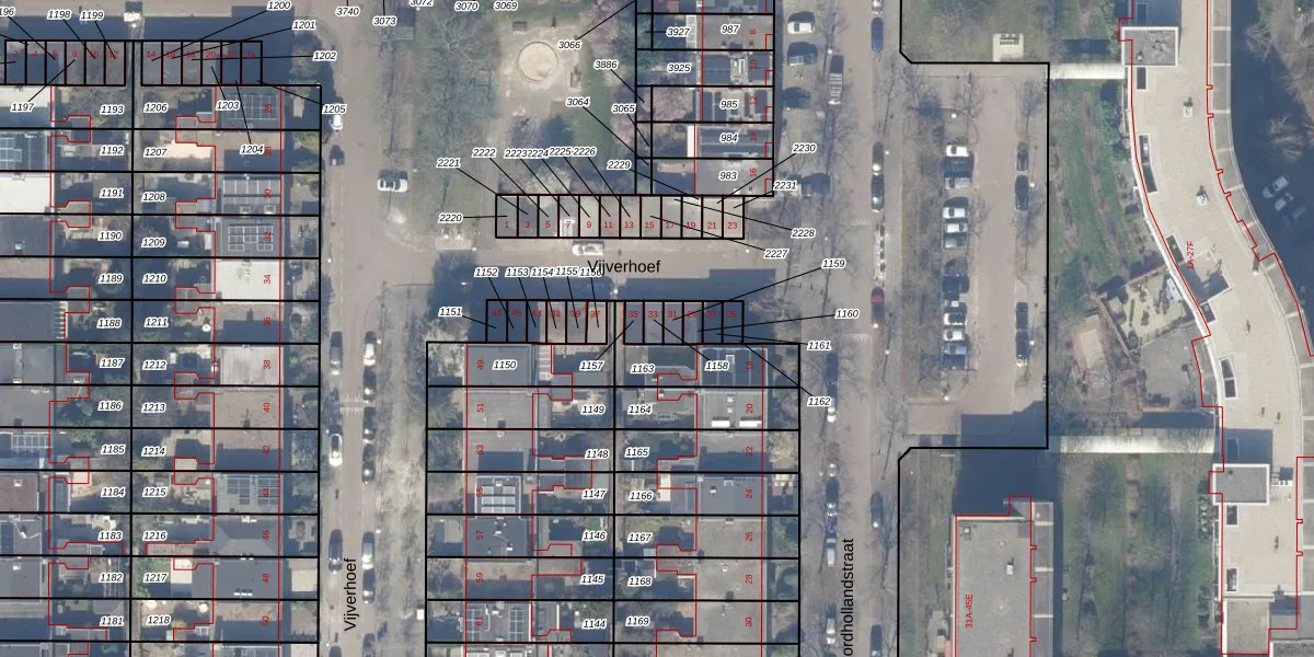 Het perceel waarop Vijverhoef 33 staat heeft een oppervlakte van 20 m². Dit is een klein perceel. De perceeloppervlakte wordt geregistreerd door het Kadaster. Gedetailleerde informatie over de maten van dit perceel kunt u vinden in het rapport Kadastrale kaart met maatvoering van Vijverhoef 33.