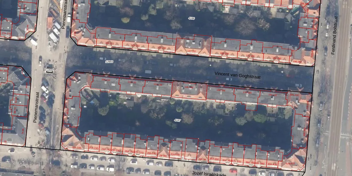 Vincent van Goghstraat 138 is gelegen op kadastraal perceel ASD18V4187. Deze kadastrale aanduiding is uniek en wordt gebruikt door het Kadaster om eigendomsrechten en andere zakelijke rechten vast te leggen. Het perceel maakt onderdeel uit van de kadastrale gemeente Amsterdam.