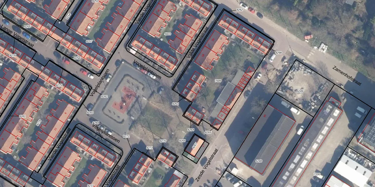 Het perceel waarop Vogelplantsoen 28 staat heeft een oppervlakte van 1757 m². Dit is een zeer groot perceel. De perceeloppervlakte wordt geregistreerd door het Kadaster. Gedetailleerde informatie over de maten van dit perceel kunt u vinden in het rapport Kadastrale kaart met maatvoering van Vogelplantsoen 28.
