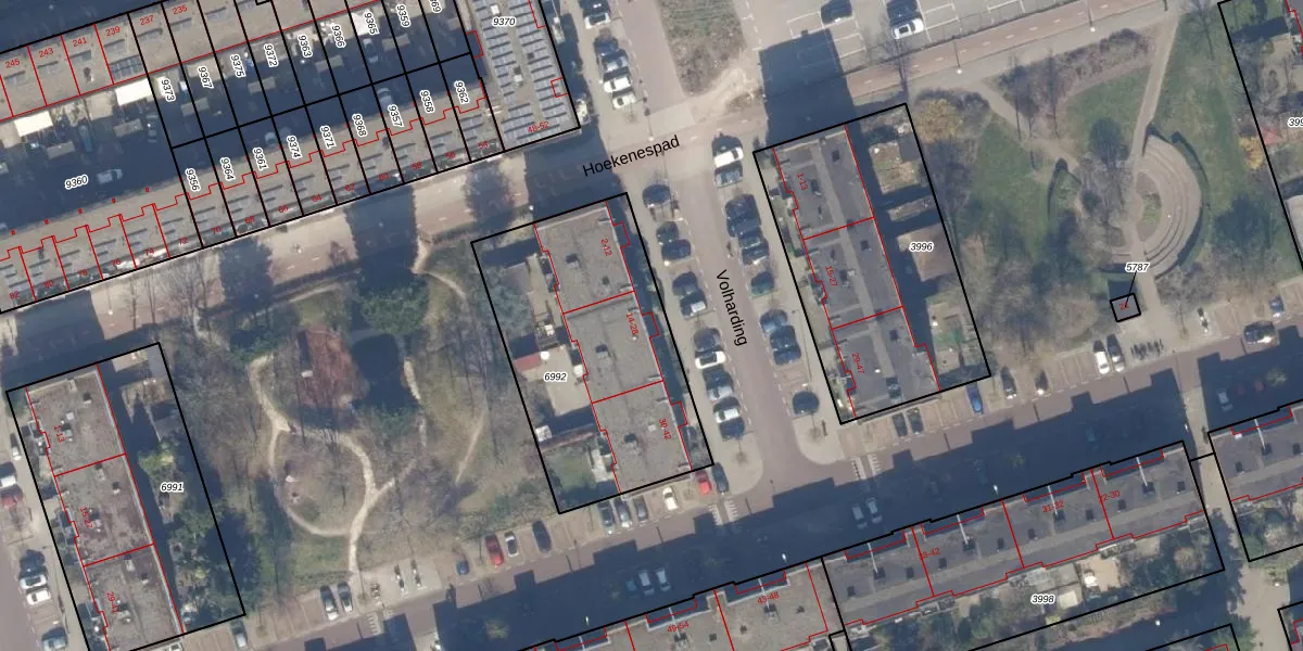 Het perceel waarop Volharding 22 staat heeft een oppervlakte van 1068 m². Dit is een zeer groot perceel. De perceeloppervlakte wordt geregistreerd door het Kadaster. Gedetailleerde informatie over de maten van dit perceel kunt u vinden in het rapport Kadastrale kaart met maatvoering van Volharding 22.