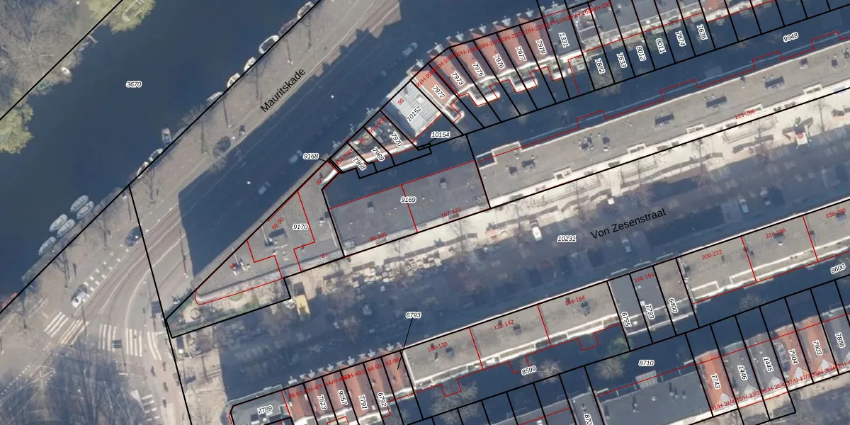 Het adres is gelegen op perceel 9169 in de sectie S en de kadastrale gemeente Amsterdam. De kadastrale aanduiding is aldus ASD15-S-9169. De oppervlakte van het perceel is 646 m². Dat is groter dan gemiddeld in Amsterdam, waar de gemiddelde perceeloppervlakte op 537,06 m² ligt. De grootste perceeloppervlakte in de kadastrale gemeente is 14,5 ha. De kleinste oppervlakte bedraagt 0 m². Op het perceel liggen in totaal 18 adressen. De huidige grenzen van het perceel zijn digitaal in de Basisregistratie Kadaster (BRK) geregistreerd op 04-10-2018.