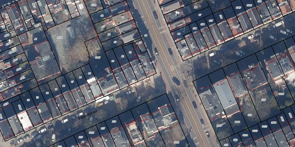 Het perceel waarop Vondelstraat 72-E staat heeft een oppervlakte van 132 m². Dit is een middelgroot perceel. De perceeloppervlakte wordt geregistreerd door het Kadaster. Gedetailleerde informatie over de maten van dit perceel kunt u vinden in het rapport Kadastrale kaart met maatvoering van Vondelstraat 72-E.