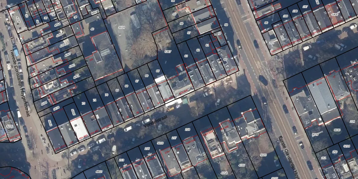 Het perceel waarop Vondelstraat 80-D staat heeft een oppervlakte van 440 m². Dit is een groot perceel. De perceeloppervlakte wordt geregistreerd door het Kadaster. Gedetailleerde informatie over de maten van dit perceel kunt u vinden in het rapport Kadastrale kaart met maatvoering van Vondelstraat 80-D.