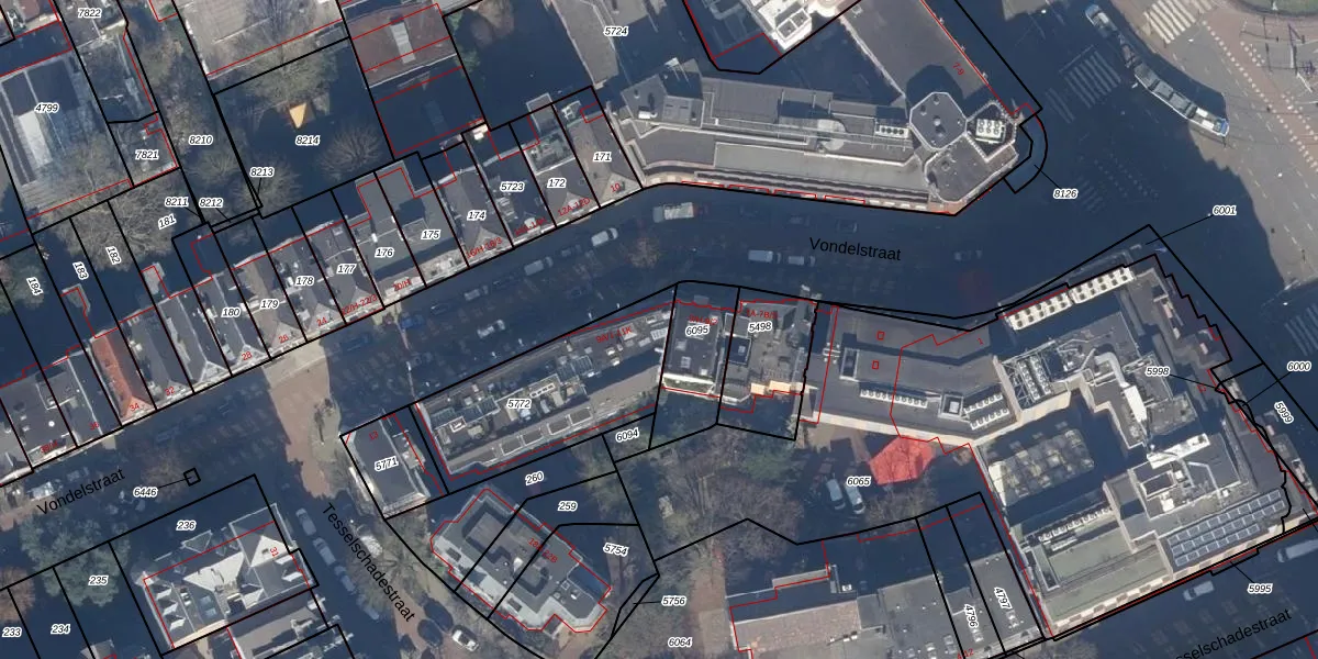 Het perceel waarop Vondelstraat 9-A-1 staat heeft een oppervlakte van 603 m². Dit is een groot perceel. De perceeloppervlakte wordt geregistreerd door het Kadaster. Gedetailleerde informatie over de maten van dit perceel kunt u vinden in het rapport Kadastrale kaart met maatvoering van Vondelstraat 9-A-1.
