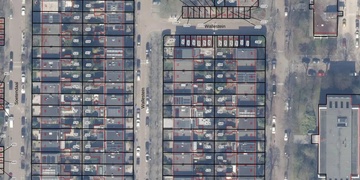 Het perceel waarop Wallestein 55 staat heeft een oppervlakte van 186 m². Dit is een middelgroot perceel. De perceeloppervlakte wordt geregistreerd door het Kadaster. Gedetailleerde informatie over de maten van dit perceel kunt u vinden in het rapport Kadastrale kaart met maatvoering van Wallestein 55.