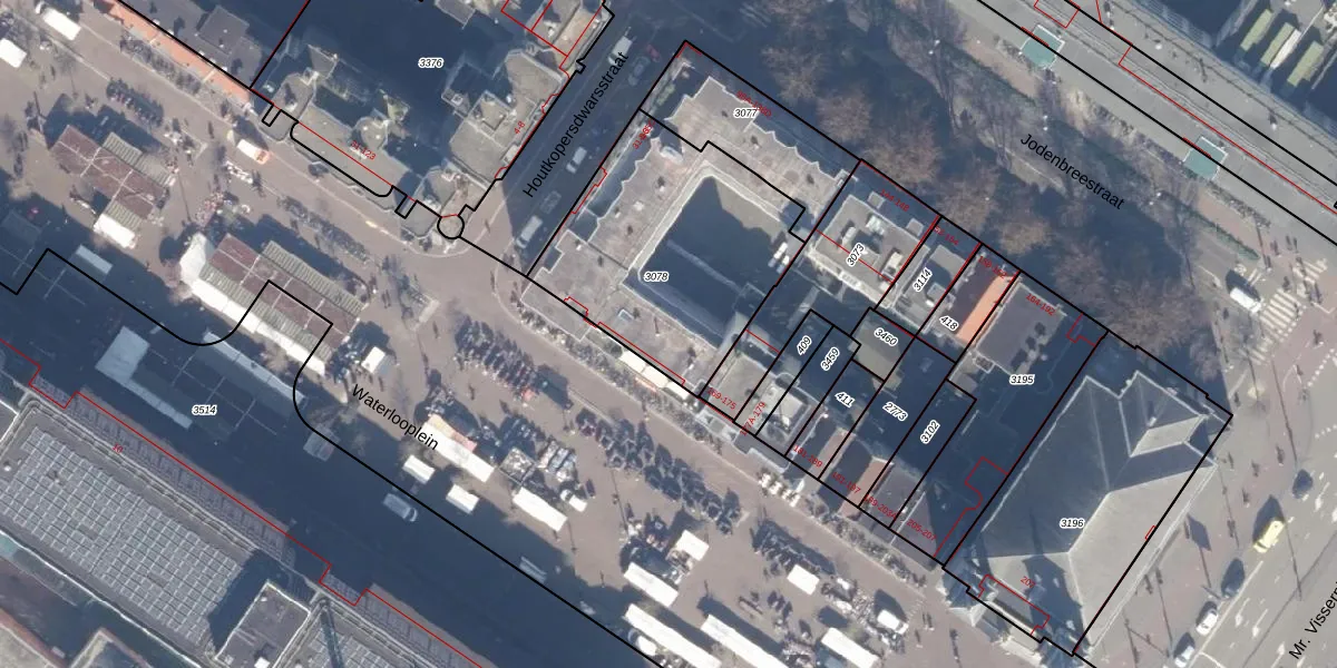 Het perceel waarop Waterlooplein 165-B staat heeft een oppervlakte van 997 m². Dit is een groot perceel. De perceeloppervlakte wordt geregistreerd door het Kadaster. Gedetailleerde informatie over de maten van dit perceel kunt u vinden in het rapport Kadastrale kaart met maatvoering van Waterlooplein 165-B.