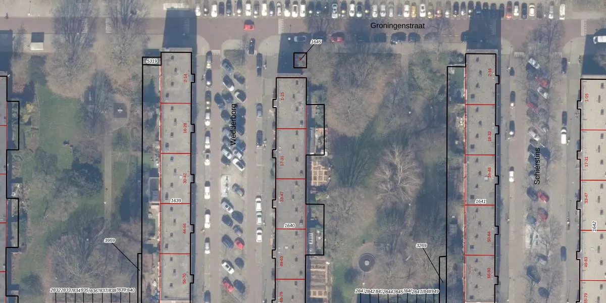 Het perceel waarop Wedderborg 23 staat heeft een oppervlakte van 1312 m². Dit is een zeer groot perceel. De perceeloppervlakte wordt geregistreerd door het Kadaster. Gedetailleerde informatie over de maten van dit perceel kunt u vinden in het rapport Kadastrale kaart met maatvoering van Wedderborg 23.