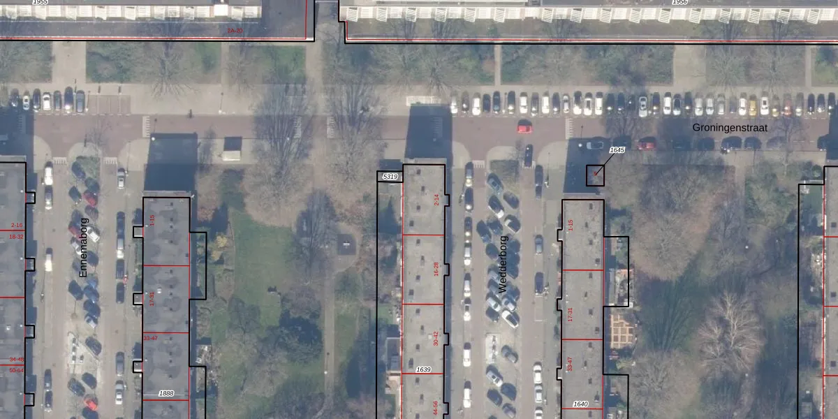 Het perceel waarop Wedderborg 8 staat heeft een oppervlakte van 1322 m². Dit is een zeer groot perceel. De perceeloppervlakte wordt geregistreerd door het Kadaster. Gedetailleerde informatie over de maten van dit perceel kunt u vinden in het rapport Kadastrale kaart met maatvoering van Wedderborg 8.