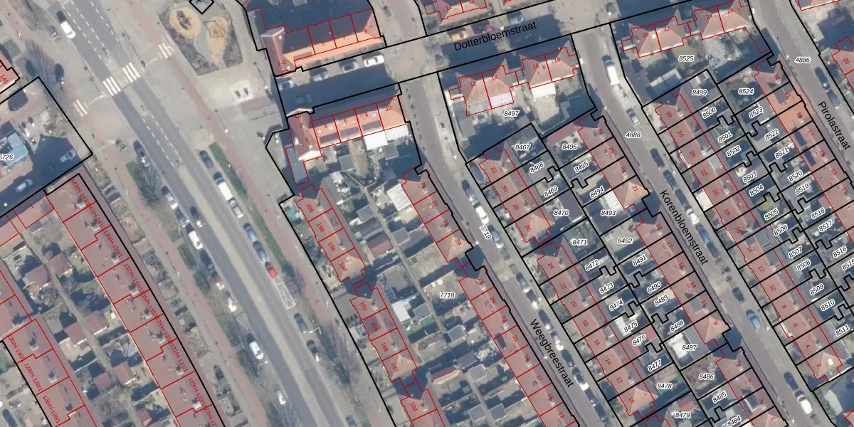 Het perceel waarop Weegbreestraat 33 staat heeft een oppervlakte van 4865 m². Dit is een zeer groot perceel. De perceeloppervlakte wordt geregistreerd door het Kadaster. Gedetailleerde informatie over de maten van dit perceel kunt u vinden in het rapport Kadastrale kaart met maatvoering van Weegbreestraat 33.