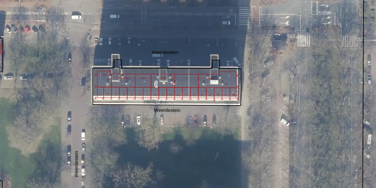 Het perceel waarop Weerdestein 12 staat heeft een oppervlakte van 1561 m². Dit is een zeer groot perceel. De perceeloppervlakte wordt geregistreerd door het Kadaster. Gedetailleerde informatie over de maten van dit perceel kunt u vinden in het rapport Kadastrale kaart met maatvoering van Weerdestein 12.