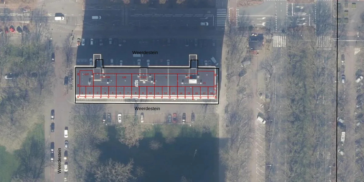Het perceel waarop Weerdestein 14 staat heeft een oppervlakte van 1561 m². Dit is een zeer groot perceel. De perceeloppervlakte wordt geregistreerd door het Kadaster. Gedetailleerde informatie over de maten van dit perceel kunt u vinden in het rapport Kadastrale kaart met maatvoering van Weerdestein 14.