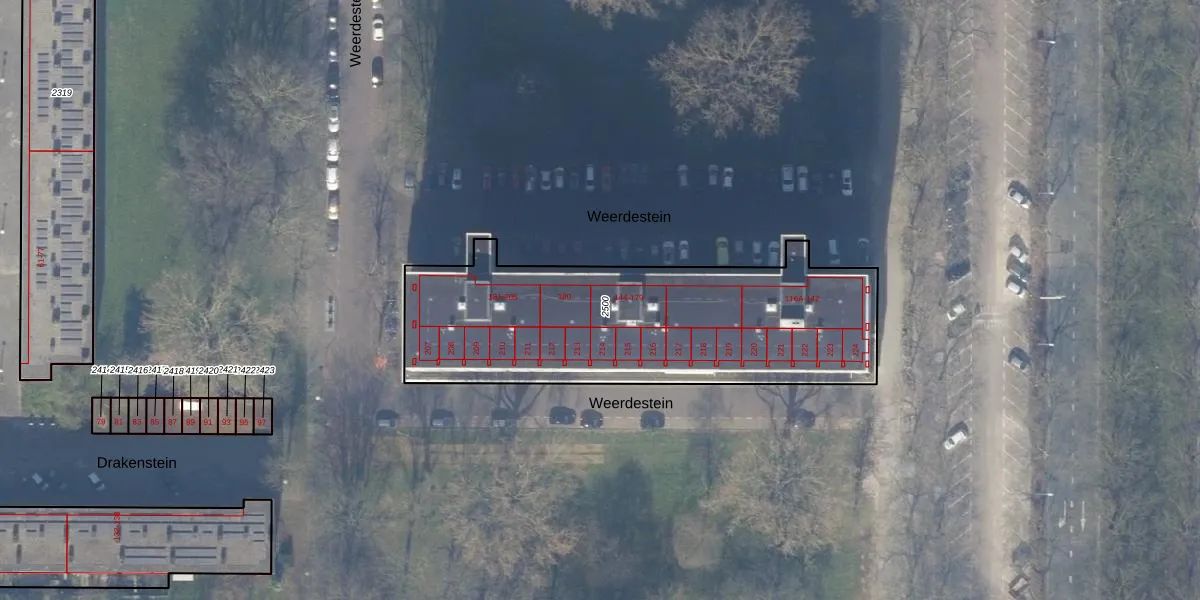Het perceel waarop Weerdestein 144 staat heeft een oppervlakte van 1563 m². Dit is een zeer groot perceel. De perceeloppervlakte wordt geregistreerd door het Kadaster. Gedetailleerde informatie over de maten van dit perceel kunt u vinden in het rapport Kadastrale kaart met maatvoering van Weerdestein 144.