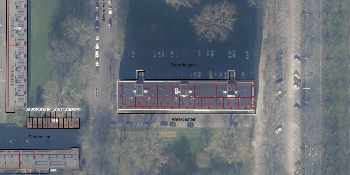 Het perceel waarop Weerdestein 148 staat heeft een oppervlakte van 1563 m². Dit is een zeer groot perceel. De perceeloppervlakte wordt geregistreerd door het Kadaster. Gedetailleerde informatie over de maten van dit perceel kunt u vinden in het rapport Kadastrale kaart met maatvoering van Weerdestein 148.