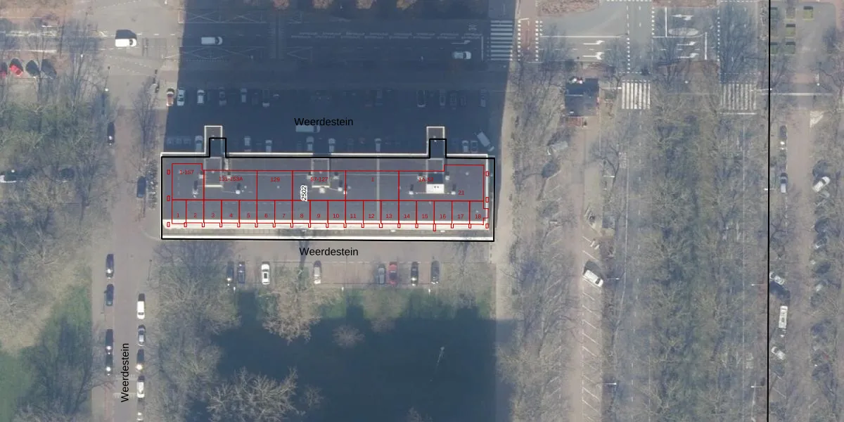 Het perceel waarop Weerdestein 15 staat heeft een oppervlakte van 1561 m². Dit is een zeer groot perceel. De perceeloppervlakte wordt geregistreerd door het Kadaster. Gedetailleerde informatie over de maten van dit perceel kunt u vinden in het rapport Kadastrale kaart met maatvoering van Weerdestein 15.