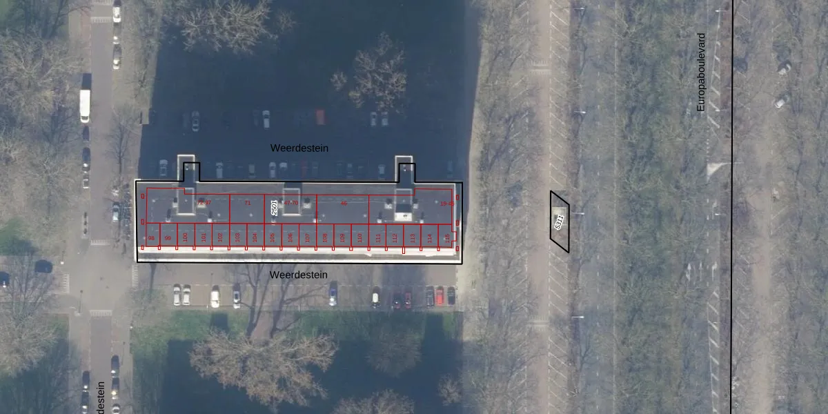 Het perceel waarop Weerdestein 24 staat heeft een oppervlakte van 1564 m². Dit is een zeer groot perceel. De perceeloppervlakte wordt geregistreerd door het Kadaster. Gedetailleerde informatie over de maten van dit perceel kunt u vinden in het rapport Kadastrale kaart met maatvoering van Weerdestein 24.