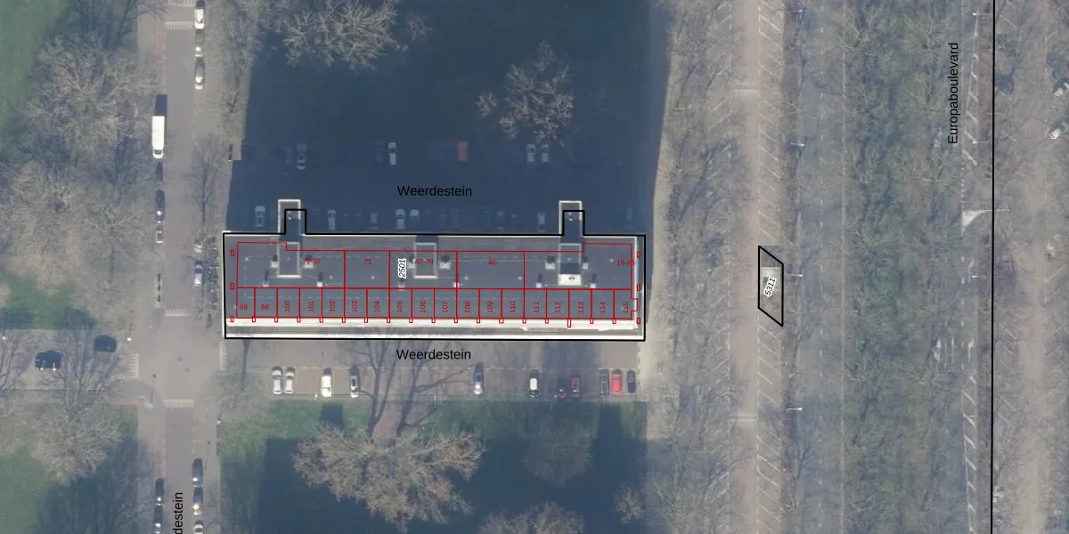 Het perceel waarop Weerdestein 44 staat heeft een oppervlakte van 1564 m². Dit is een zeer groot perceel. De perceeloppervlakte wordt geregistreerd door het Kadaster. Gedetailleerde informatie over de maten van dit perceel kunt u vinden in het rapport Kadastrale kaart met maatvoering van Weerdestein 44.