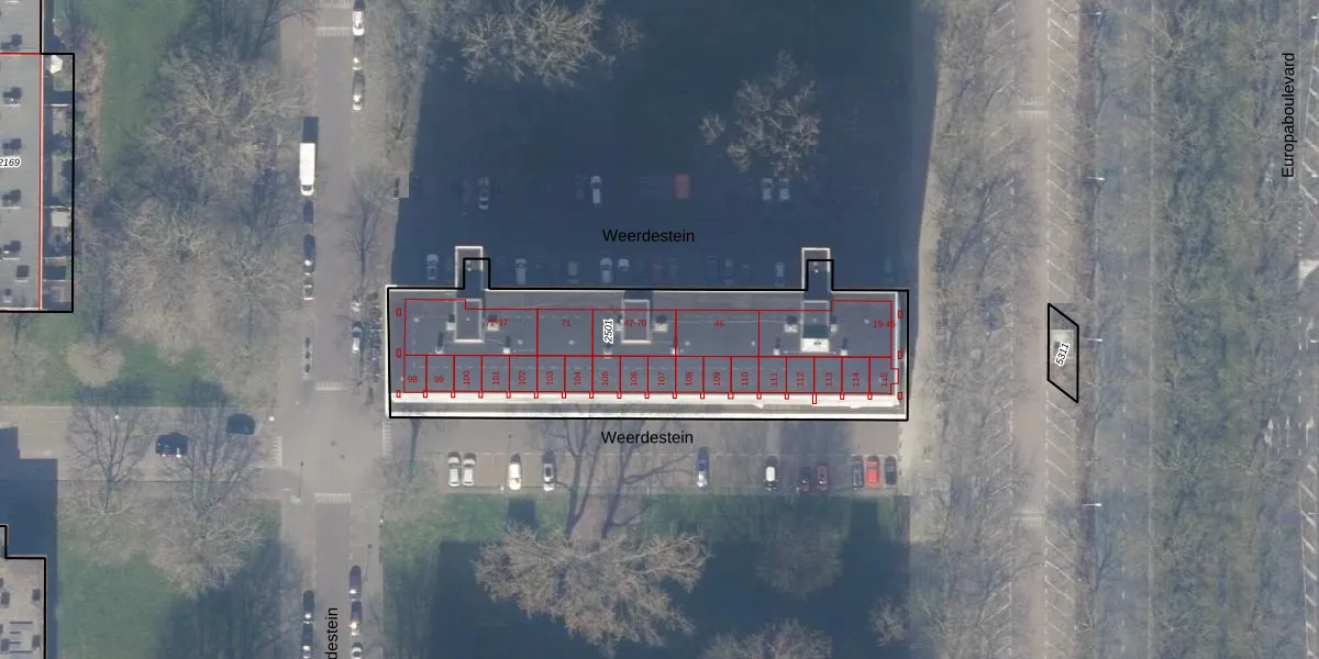 Het perceel waarop Weerdestein 51 staat heeft een oppervlakte van 1564 m². Dit is een zeer groot perceel. De perceeloppervlakte wordt geregistreerd door het Kadaster. Gedetailleerde informatie over de maten van dit perceel kunt u vinden in het rapport Kadastrale kaart met maatvoering van Weerdestein 51.