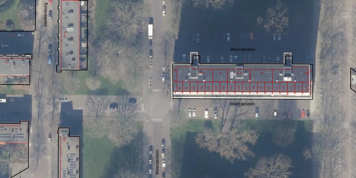 Het perceel waarop Weerdestein 98 staat heeft een oppervlakte van 1564 m². Dit is een zeer groot perceel. De perceeloppervlakte wordt geregistreerd door het Kadaster. Gedetailleerde informatie over de maten van dit perceel kunt u vinden in het rapport Kadastrale kaart met maatvoering van Weerdestein 98.