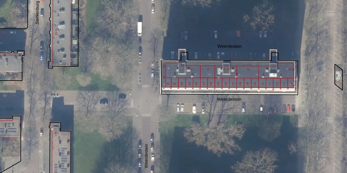 Het perceel waarop Weerdestein 99 staat heeft een oppervlakte van 1564 m². Dit is een zeer groot perceel. De perceeloppervlakte wordt geregistreerd door het Kadaster. Gedetailleerde informatie over de maten van dit perceel kunt u vinden in het rapport Kadastrale kaart met maatvoering van Weerdestein 99.