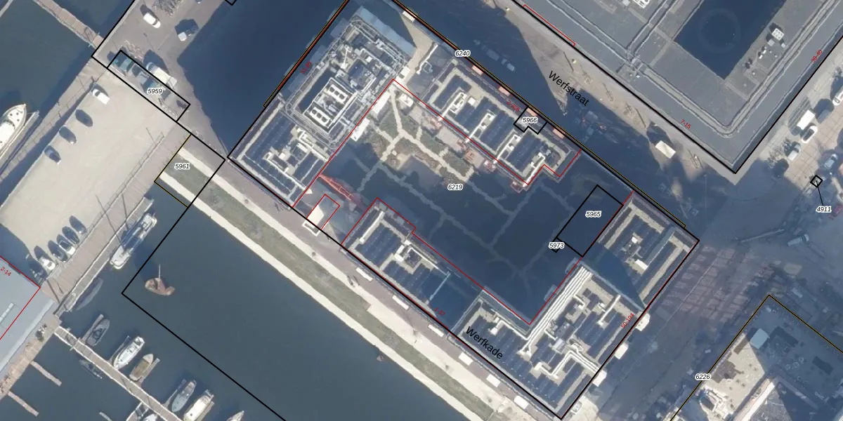 Het perceel waarop Werfkade 23 staat heeft een oppervlakte van 5231 m². Dit is een zeer groot perceel. De perceeloppervlakte wordt geregistreerd door het Kadaster. Gedetailleerde informatie over de maten van dit perceel kunt u vinden in het rapport Kadastrale kaart met maatvoering van Werfkade 23.