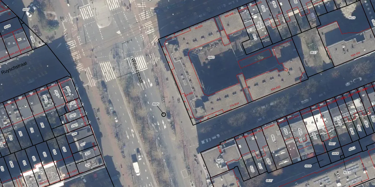 Het perceel waarop Wibautstraat 47-B staat heeft een oppervlakte van 2738 m². Dit is een zeer groot perceel. De perceeloppervlakte wordt geregistreerd door het Kadaster. Gedetailleerde informatie over de maten van dit perceel kunt u vinden in het rapport Kadastrale kaart met maatvoering van Wibautstraat 47-B.