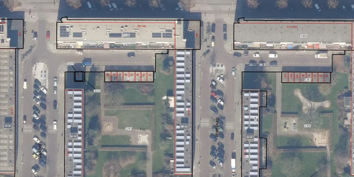 Het perceel waarop Wijenburg 112 staat heeft een oppervlakte van 5040 m². Dit is een zeer groot perceel. De perceeloppervlakte wordt geregistreerd door het Kadaster. Gedetailleerde informatie over de maten van dit perceel kunt u vinden in het rapport Kadastrale kaart met maatvoering van Wijenburg 112.
