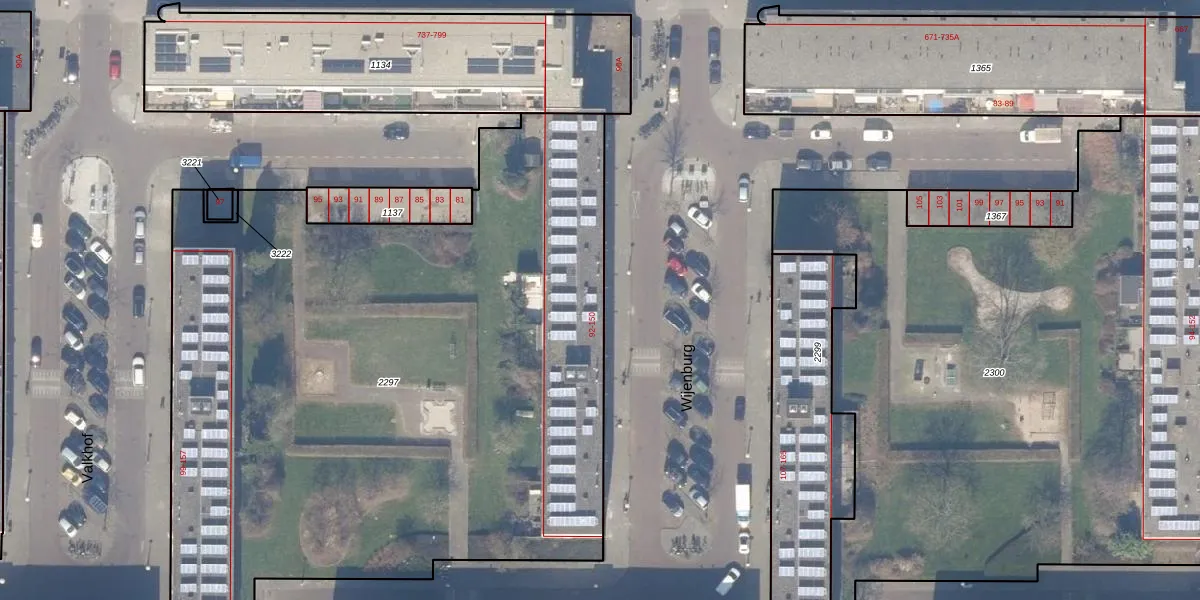 Het perceel waarop Wijenburg 114 staat heeft een oppervlakte van 5040 m². Dit is een zeer groot perceel. De perceeloppervlakte wordt geregistreerd door het Kadaster. Gedetailleerde informatie over de maten van dit perceel kunt u vinden in het rapport Kadastrale kaart met maatvoering van Wijenburg 114.