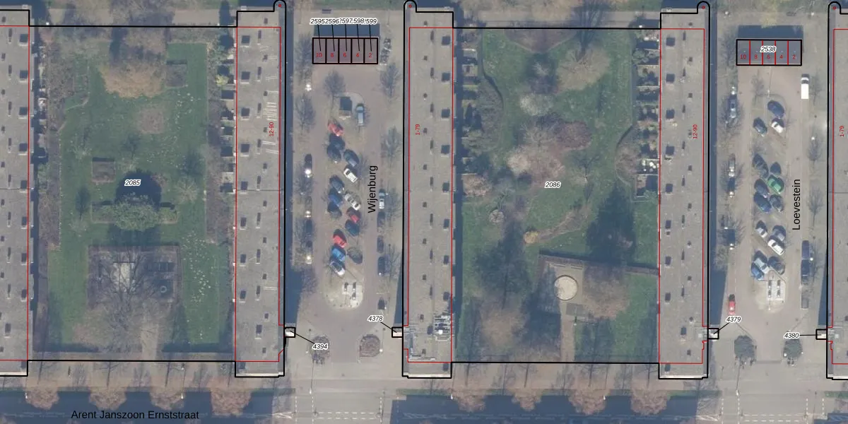 Het perceel waarop Wijenburg 19 staat heeft een oppervlakte van 5864 m². Dit is een zeer groot perceel. De perceeloppervlakte wordt geregistreerd door het Kadaster. Gedetailleerde informatie over de maten van dit perceel kunt u vinden in het rapport Kadastrale kaart met maatvoering van Wijenburg 19.