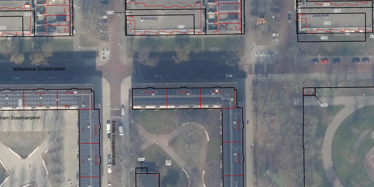 Het perceel waarop Wilhelmina Druckerstraat 13-2 staat heeft een oppervlakte van 1405 m². Dit is een zeer groot perceel. De perceeloppervlakte wordt geregistreerd door het Kadaster. Gedetailleerde informatie over de maten van dit perceel kunt u vinden in het rapport Kadastrale kaart met maatvoering van Wilhelmina Druckerstraat 13-2.