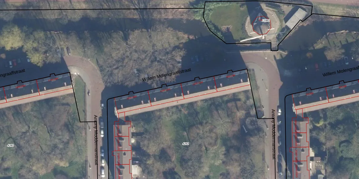Het perceel waarop Willem Molengraaffstraat 13-M staat heeft een oppervlakte van 4972 m². Dit is een zeer groot perceel. De perceeloppervlakte wordt geregistreerd door het Kadaster. Gedetailleerde informatie over de maten van dit perceel kunt u vinden in het rapport Kadastrale kaart met maatvoering van Willem Molengraaffstraat 13-M.