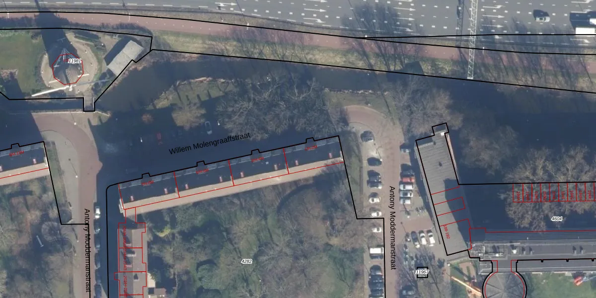 Het perceel waarop Willem Molengraaffstraat 2-1 staat heeft een oppervlakte van 4971 m². Dit is een zeer groot perceel. De perceeloppervlakte wordt geregistreerd door het Kadaster. Gedetailleerde informatie over de maten van dit perceel kunt u vinden in het rapport Kadastrale kaart met maatvoering van Willem Molengraaffstraat 2-1.