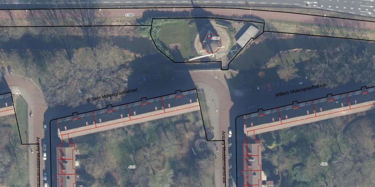 Het perceel waarop Willem Molengraaffstraat 9-2 staat heeft een oppervlakte van 4972 m². Dit is een zeer groot perceel. De perceeloppervlakte wordt geregistreerd door het Kadaster. Gedetailleerde informatie over de maten van dit perceel kunt u vinden in het rapport Kadastrale kaart met maatvoering van Willem Molengraaffstraat 9-2.