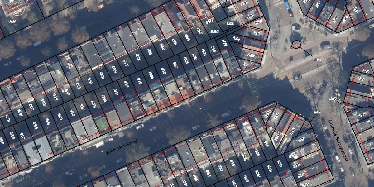 Het perceel waarop Willemsparkweg 182-3 staat heeft een oppervlakte van 169 m². Dit is een middelgroot perceel. De perceeloppervlakte wordt geregistreerd door het Kadaster. Gedetailleerde informatie over de maten van dit perceel kunt u vinden in het rapport Kadastrale kaart met maatvoering van Willemsparkweg 182-3.