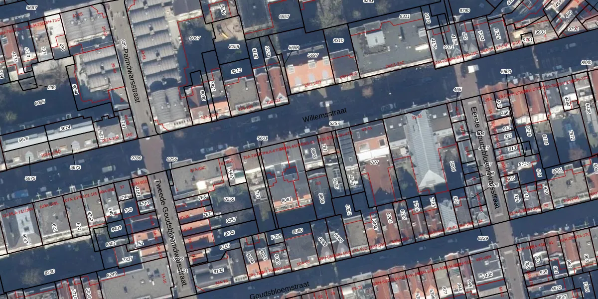 Het perceel waarop Willemsstraat 65-1A staat heeft een oppervlakte van 371 m². Dit is een groot perceel. De perceeloppervlakte wordt geregistreerd door het Kadaster. Gedetailleerde informatie over de maten van dit perceel kunt u vinden in het rapport Kadastrale kaart met maatvoering van Willemsstraat 65-1A.