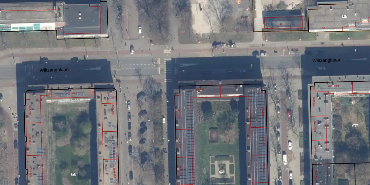 Het perceel waarop Wiltzanghlaan 47 staat heeft een oppervlakte van 4186 m². Dit is een zeer groot perceel. De perceeloppervlakte wordt geregistreerd door het Kadaster. Gedetailleerde informatie over de maten van dit perceel kunt u vinden in het rapport Kadastrale kaart met maatvoering van Wiltzanghlaan 47.