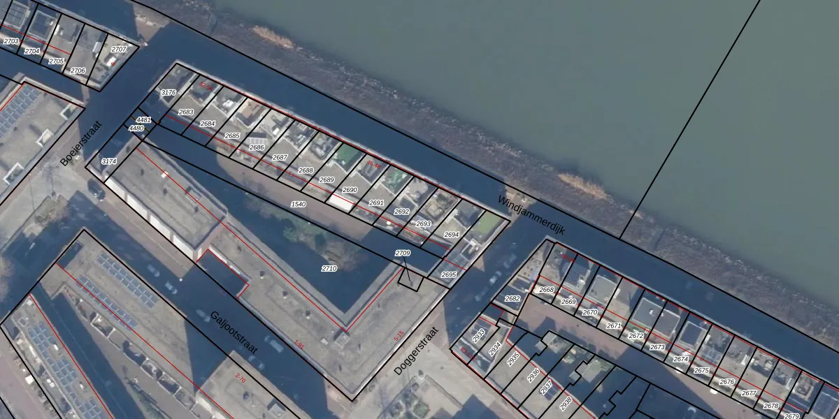 Het perceel waarop Windjammerdijk 54 staat heeft een oppervlakte van 95 m². Dit is een klein perceel. De perceeloppervlakte wordt geregistreerd door het Kadaster. Gedetailleerde informatie over de maten van dit perceel kunt u vinden in het rapport Kadastrale kaart met maatvoering van Windjammerdijk 54.