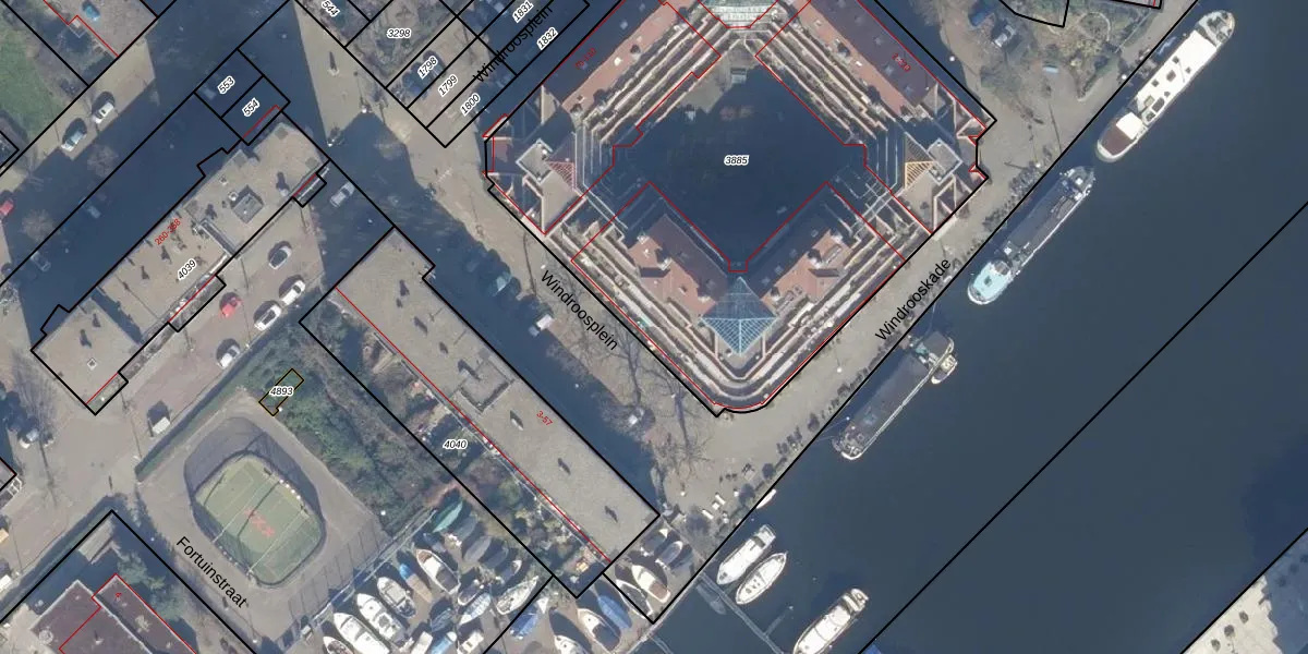 Het perceel waarop Windroosplein 24 staat heeft een oppervlakte van 3613 m². Dit is een zeer groot perceel. De perceeloppervlakte wordt geregistreerd door het Kadaster. Gedetailleerde informatie over de maten van dit perceel kunt u vinden in het rapport Kadastrale kaart met maatvoering van Windroosplein 24.