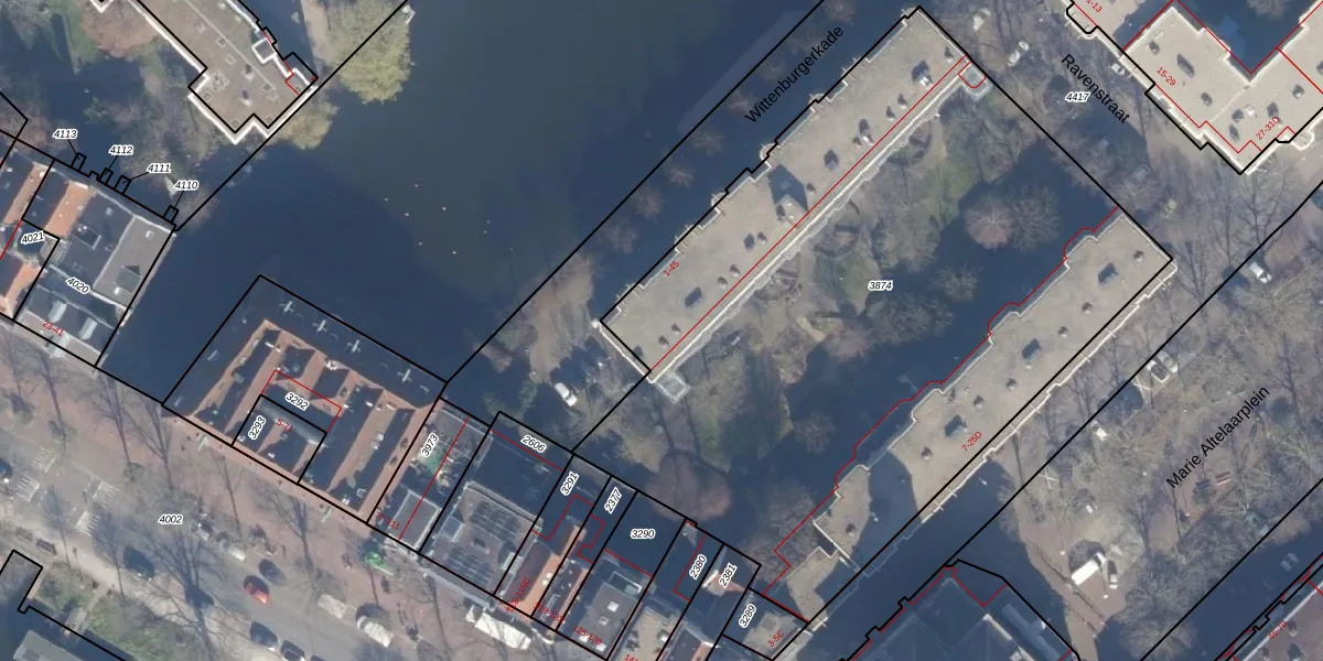 Het perceel waarop Wittenburgerkade 10 staat heeft een oppervlakte van 4258 m². Dit is een zeer groot perceel. De perceeloppervlakte wordt geregistreerd door het Kadaster. Gedetailleerde informatie over de maten van dit perceel kunt u vinden in het rapport Kadastrale kaart met maatvoering van Wittenburgerkade 10.