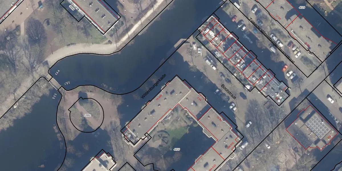 Het perceel waarop Wittenburgerkade 108 staat heeft een oppervlakte van 2654 m². Dit is een zeer groot perceel. De perceeloppervlakte wordt geregistreerd door het Kadaster. Gedetailleerde informatie over de maten van dit perceel kunt u vinden in het rapport Kadastrale kaart met maatvoering van Wittenburgerkade 108.