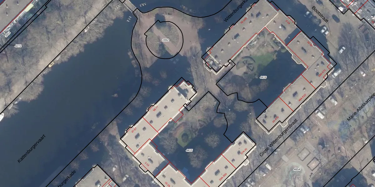 Het perceel waarop Wittenburgerkade 69 staat heeft een oppervlakte van 2664 m². Dit is een zeer groot perceel. De perceeloppervlakte wordt geregistreerd door het Kadaster. Gedetailleerde informatie over de maten van dit perceel kunt u vinden in het rapport Kadastrale kaart met maatvoering van Wittenburgerkade 69.