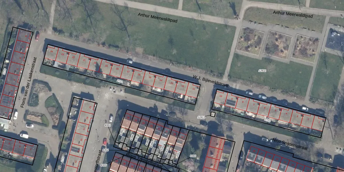 Het perceel waarop W.J. Bijleveldstraat 13 staat heeft een oppervlakte van 1108 m². Dit is een zeer groot perceel. De perceeloppervlakte wordt geregistreerd door het Kadaster. Gedetailleerde informatie over de maten van dit perceel kunt u vinden in het rapport Kadastrale kaart met maatvoering van W.J. Bijleveldstraat 13.