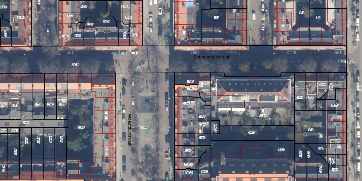 Het perceel waarop Woestduinstraat 65-H staat heeft een oppervlakte van 90 m². Dit is een klein perceel. De perceeloppervlakte wordt geregistreerd door het Kadaster. Gedetailleerde informatie over de maten van dit perceel kunt u vinden in het rapport Kadastrale kaart met maatvoering van Woestduinstraat 65-H.