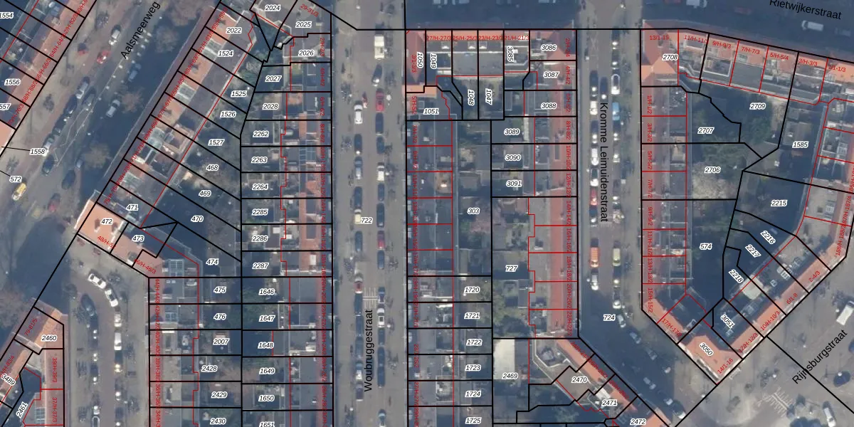 Het perceel waarop Woubruggestraat 13-2 staat heeft een oppervlakte van 732 m². Dit is een groot perceel. De perceeloppervlakte wordt geregistreerd door het Kadaster. Gedetailleerde informatie over de maten van dit perceel kunt u vinden in het rapport Kadastrale kaart met maatvoering van Woubruggestraat 13-2.