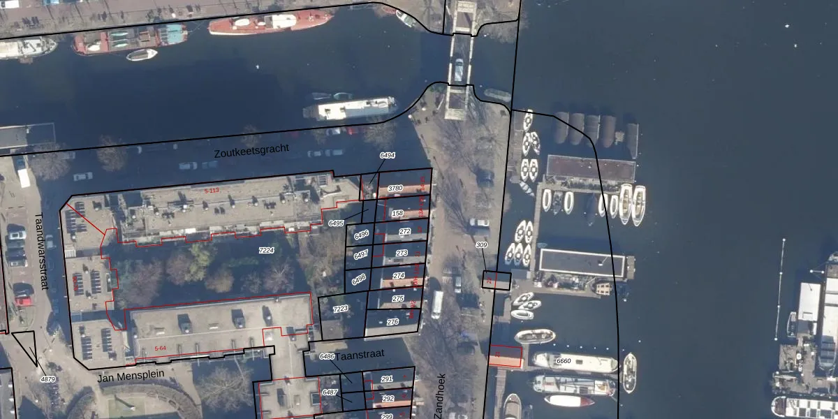 Zandhoek 13-A is gelegen op kadastraal perceel ASD09M158. Deze kadastrale aanduiding is uniek en wordt gebruikt door het Kadaster om eigendomsrechten en andere zakelijke rechten vast te leggen. Het perceel maakt onderdeel uit van de kadastrale gemeente Amsterdam.